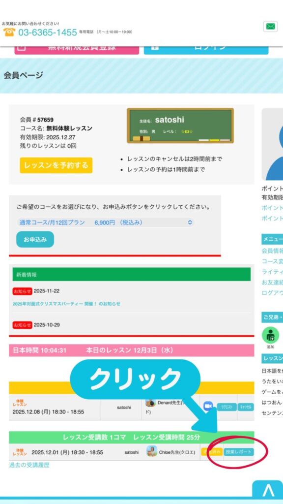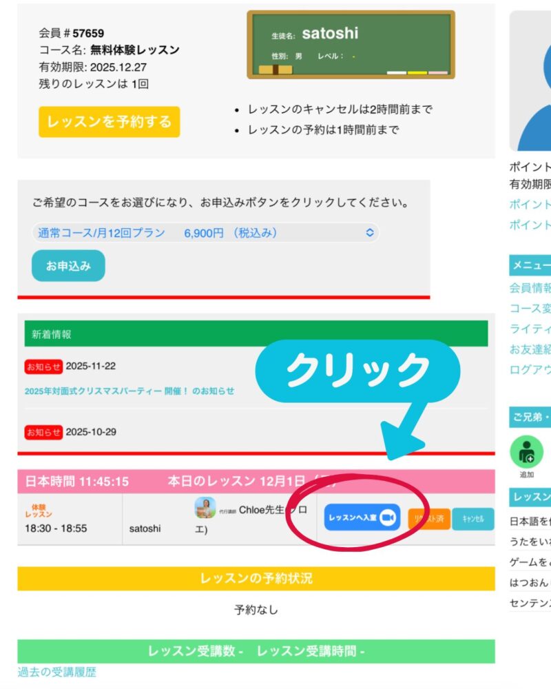 マイページの〈レッスンへ入室〉からズームに入ります。