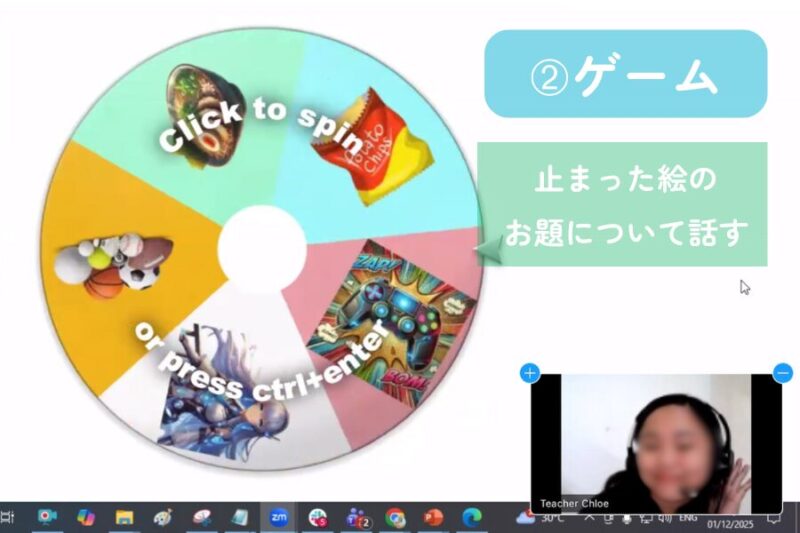 この日はルーレットでした。先生がまわすルーレットを止めて、止まった絵のお題について話すというものです。