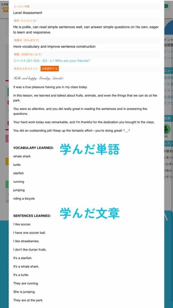 ふざけすぎることがあるが、上手い具合にレッスンに戻してくれ、英語力だけでなく子供の心理をよく理解した柔軟な対応をしてくれます。1ヶ月先まで予約を取れるので、スケジュールを組みやすいです。子供の習慣も付きやすく、親も全くの苦手ですが、一緒に楽しんでます。息子は機嫌に波があるのですが、やる気のないときも先生がゲーム等をしてひきつけてくれます。以前ネイティブの英会話教室に通わせていましたが、いつも他の子の発言で終わっていました。オンライン英会話はマンツーマンなので、常に自分の番で、今ではかなり積極的になれています。